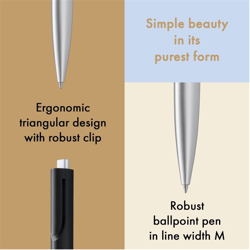 Kaum ein Schreibgerät ist so radikal auf seine Funktion reduziert wie der LAMY noto. Wer Design liebt, wird auf diesen Kugelschreiber nicht verzichten wollen: Das monolithische Design in Dreiecksform mündet in einen Clip, der formal aus der Gehäusekontur entsteht – schlichte Schönheit in ihrer Reinform.
