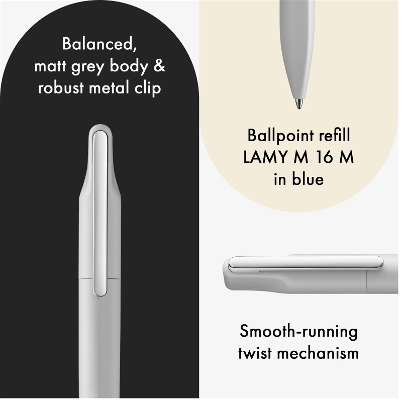 Der LAMY xevo ist das Einstiegsmodell in die Welt des LAMY Designs: Der ausbalancierte Korpus beeindruckt mit einem unmerklichen Übergang der Dreiecksform des Griffstücks in einen Kreis. Den Abschluss bildet ein federnd gelagerter Clip aus Metall auf einer konkaven Form. Die leichtgängige Drehmechanik und das weiche Schreibgefühl der Großraummine LAMY M 16 sind zwei weitere Gründe, weshalb der LAMY xevo auf der Beliebtheitsskala anspruchsvoller Vielschreiber:innen weit oben steht: Das Zusammenspiel aus herausragendem Design und technischer Perfektion repräsentiert alle Merkmale eines typischen LAMY Schreibgerätes.