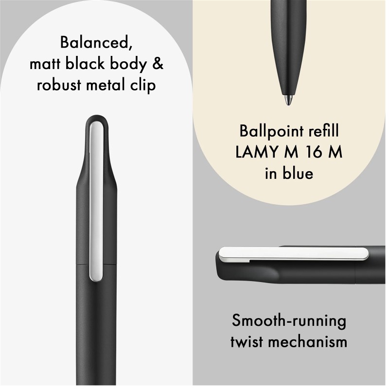 Kugelschreiber mit Drehmechanik · Kunststoff mattschwarz · mit Großraummine LAMY M 16 M blau